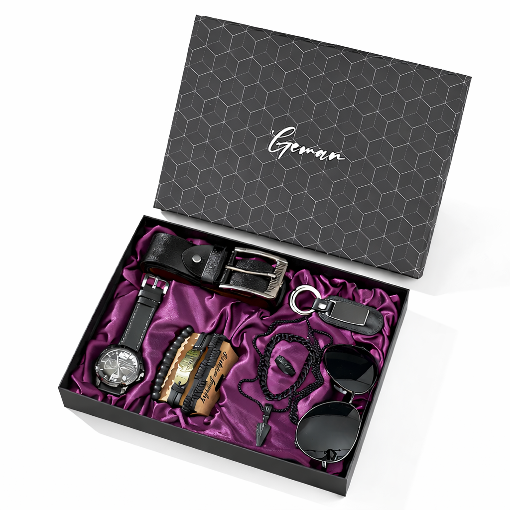 Inside the Box: Classic analog watch Premium leather belt Stylish sunglasses Multi-layer bracelet set Modern pendant necklace Leather keychain Timeless pieces. One powerful statement.